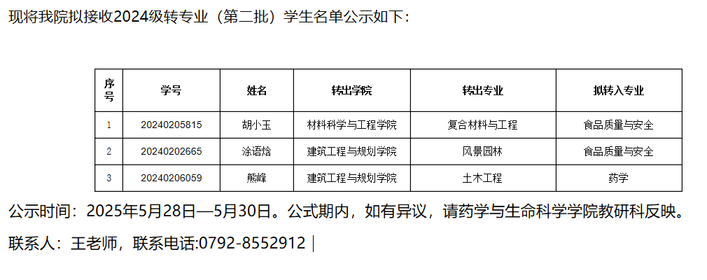 药学与生命科学学院拟接收转专业学生名单公示(2024级第二批)